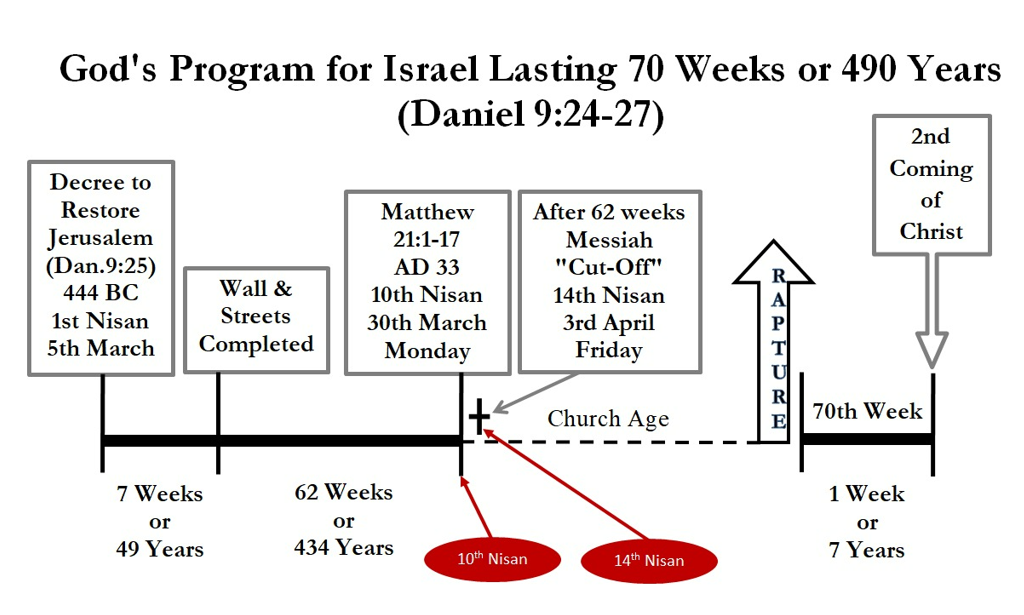 In conclusion, the phrase “Until the Messiah the Prince” refers to the appearance of the Messiah, specifically referring to the day He dedicated Himself as the Paschal Lamb of God which He did during His triumphant entry into Jerusalem riding on a donkey. That day was Monday 10th Nisan which corresponds to 30th March, AD 33.
