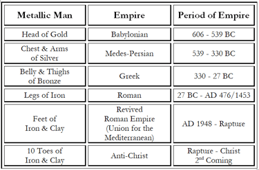 The Metallic Man in Daniel 2 and the four beasts in Daniel 7 referred to the same thing, i.e. they referred to the Babylonian, Medes-Persian, Greek and the Roman Empires (Daniel 7:3-8).